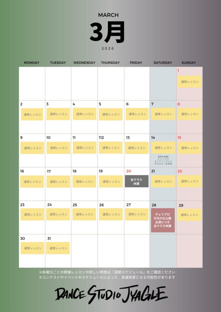 2026年3月レッスンスケジュール 2026 2/13 スケジュール 2026年2月13日 \ 2月13日更新 / ・3月28日は光が丘公園で開催される「チェリーブロッサムフェスタ」のダンスステージに出演しますので、全クラス休講です \ 週間スケジュールはこちら / レッスンスケジュール (6)ダウンロード 各クラスの詳細や料金は「CLASS/PRICE」のページも併せてどうぞ。 スケジュール よかったらシェアしてね! URLをコピーしました!