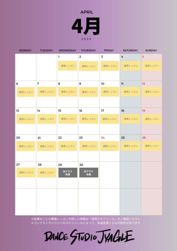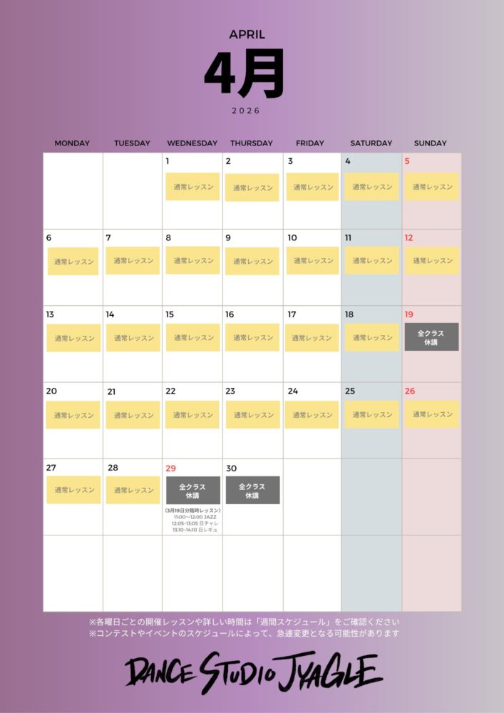 ・4月29日と30日は、スタジオの年間休講日となり全クラスおやすみです。